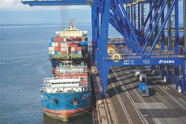 货轮在洋浦国际集装箱码头装卸货物。海南日报记者 袁琛 摄